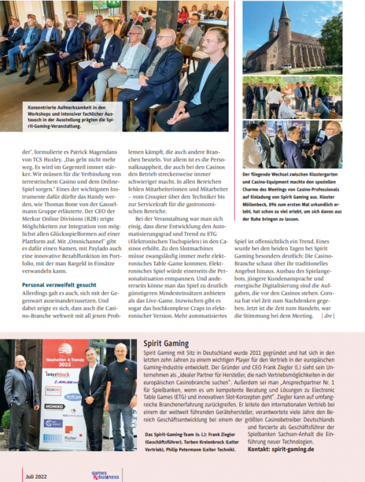 Allerdings galt es auch, sich mit der Gegenwart auseinanderzusetzen. Und dabei zeigte es sich, dass auch die Casino-Branche weltweit mit all jenen Problemen kämpft, die auch andere Branchen beuteln. Vor allem ist es die Personalknappheit, die auch bei den Casinos den Betrieb streckenweise immer schwieriger macht. In allen Bereichen fehlen Mitarbeiterinnen und Mitarbeiter – vom Croupier über den Techniker bis zur Servicekraft für die gastronomischen Bereiche. Bei der Veranstaltung war man sich einig, dass diese Entwicklung den Automatisierungsgrad und Trend zu ETG (Elektronischen Tischspielen) in den Casinos erhöht. Zu den Slotmachines müsse zwangsläufig immer mehr elektronisches Table-Game kommen. Elektronisches Spiel würde einerseits die Personalsituation entspannen. Und andererseits könne man das Spiel zu deutlich günstigeren Mindesteinsätzen anbieten als das Live-Game. Inzwischen gibt es sogar das hochkomplexe Craps in elektronischer Version. Mehr automatisiertes Spiel ist offensichtlich ein Trend. Eines wurde bei den beiden Tagen bei Spirit Gaming besonders deutlich: Die CasinoBranche schaut über ihr traditionelles Angebot hinaus. Ausbau des Spielangebots, jüngere Kundenansprache und energische Digitalisierung sind die Aufgaben, die vor den Casinos stehen. Corona hat viel Zeit zum Nachdenken gegeben. Jetzt ist die Zeit zum Handeln, war die Stimmung bei dem Meeting.